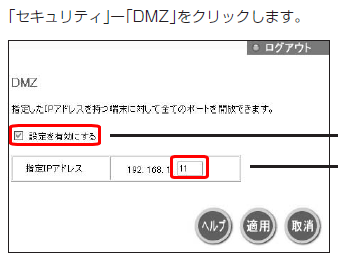パソコンのIPアドレス一番最後の数値を入力し、有効にクリックしてチェックを入れ、適用をクリックします。