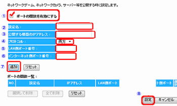 下記の項目に必要な情報を入力します。開いたページの下図と同じ項目に、必要な情報を入力すればポート開放させることが可能です。