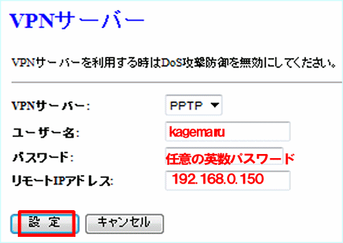 下記の様に設定すると使えると思います。VPNサーバPPTPを選択、ユーザー名はクライアントPPTP接続設定時に必要なユーザーIDとなります。任意の名称を英数で設定します。パスワードも接続時必要なパスワードとなりますので英数で任意のパスワードを決定して下さい。IPアドレスはプライベートIPアドレスIPv4の範囲内なら何でも構いません。わかりやすい様に192.168.0.150とさせて頂いております。192.168.1.10等でも大丈夫だと思います。入力出来たら設定ボタンを選んで下さい。
