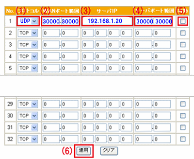 - サーバポートも30000-30000と入力します。(LAN側ポート番号)