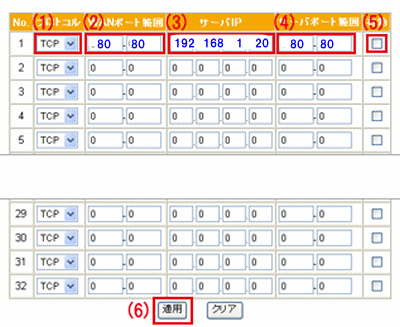 - サーバポートも80-80と入力します。(LAN側ポート番号)