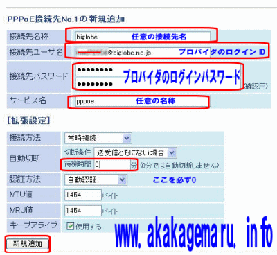 広帯域接続設定になるので必ずログインIDにドメイン名も付加して設定する必要があります。ドメイン名例:BIGLOBE会員なら、例えばログインIDが ppp0123なら@biglobe.ne.jpを付加します。