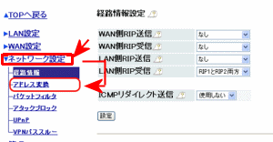 表示されたページの左メニューのネットワーク設定からアドレス変換メニューを選択してください。