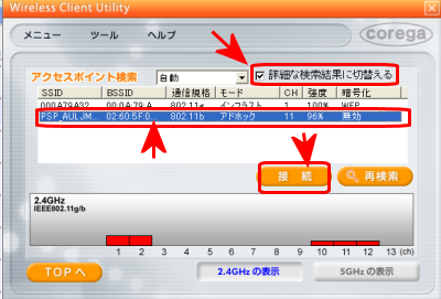 PSP・・~とモード「アドホック」の無線アクセスポイントをクリックして「接続」をクリックします。