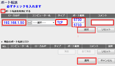 以上までが基本ポート開放になります。3658番の設定が作成出来たら適用をクリックして、設定を保存し再起動させて下さい。