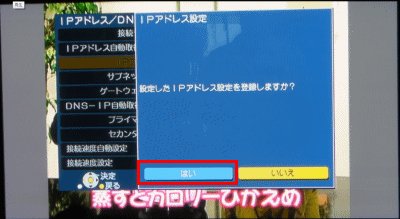 固定IPアドレスの設定が完了した決定ボタンを押してはいを選んで決定でIPアドレス固定設定完了になります。