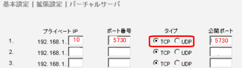 公開ポート番号:上記ポート番号と同じものを入力 例:5730