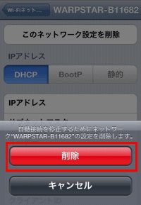 次に切り替わった画面(Wi-Fi接続状態画面)で、このネットワーク設定を削除をタッチ