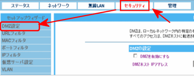 設定画面が表示されたら、セキュリティからDMZメニューをクリックして設定画面を切り替えて下さい。