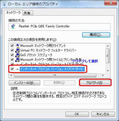 インターネットプロトコルバージョン4(TCP/IPv4)をクリックして選択しプロパティを開きます
