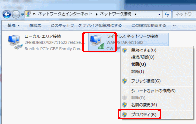 Windows7 ネットワーク接続画面の表示方法を参考に以下のネットワークアダプターアイコンのプロパティから設定します。
