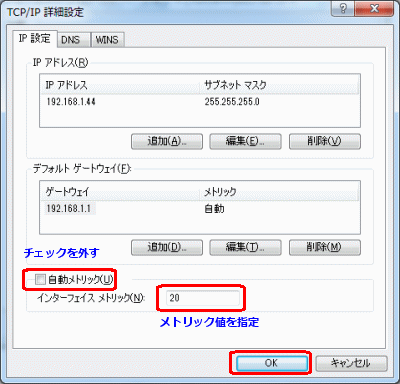 - インターフェースメトリックを20(ギガビットの場合は10)
