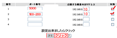 入力出来ましたら、画面したの【設定】ボタンをクリックし、【再起動】ボタンをクリックします。ルータの再起動が完了出来ましたらポートが開放されているかをご確認下さい。