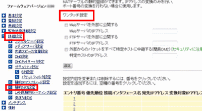 ワンタッチ設定項目にある「外部からのパケットをすべて特定ホストに中継する(簡易DMZ)」にチェックを入れます。