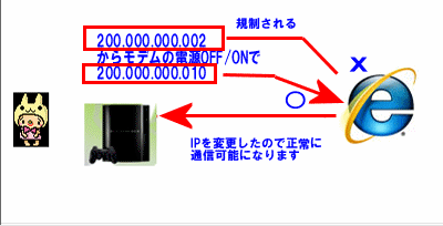 上記の作業で、例えば規制されてしまったIPアドレスが偶然割り当てられる事があり図の様にモデムの電源OFF/ONで異なるIPアドレスを取得する事により規制されることなく正常に通信を行なう事が出来るようになります。
