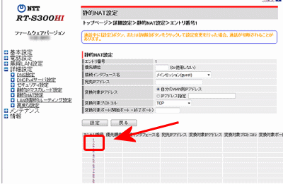 静的NAT画面が開いたらエントリ番号1から2・3・4とありますのでまず1番を選択して設定を行います。(注意いきなり10等に飛んで設定してはいけません。)