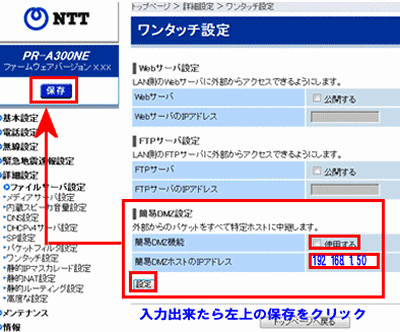簡易DMZホストのIPアドレスに192.168.1.40と入力し設定ボタンをクリックします。