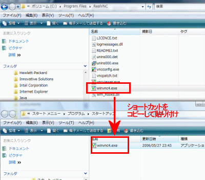 開いたスタートアップフォルダにC:\Program Files\RealVNCフォルダからwinvnc4.exeのショートカットを作成しコピーして貼り付けします。
