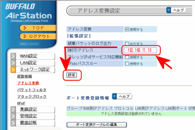 DMZのアドレス項目に設定したい機器のIPアドレス(例:192.168.11.10)を入力して設定ボタンを選択すると作業完了です。