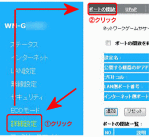 設定画面左側のメニュー詳細を開き、開いたページのポートの開放から必要な情報を入力します。
