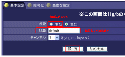 まず基本設定のメニューが開くので、機能を有効にチェックします。SSID名、defaultがSSID名となる様子なのですが、一応念のため確認下さい。無線機能を有効に切り替えたら設定ボタンを選んで下さい。次に暗号化キー(パスワード)を設定します。備考、ここのチャンネルですが、可能なら5か6か7に変更を加えてもらったほうが望ましいです。