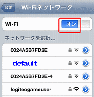 検出無線LANのSSID名一覧が表示されます。defaultを選択します。