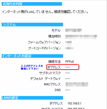 設定を行う前にかならずステータスのIPアドレスがプライベートIPアドレでは無いことを確認して下さい。ルータにログインすると以下の画面がトップページで表示されていますので、インターネットの設定項目にありますIPアドレスが例えば192.168.1.2や192.168.24.21等、192から始まる場合は二重ルータです。背面にあるRT/AP/自動のスイッチをAP側に切り替えてブリッジモードに切り替えて、本機と繋いでいるモデムにルータ機能がありますのでそちらにポート開放設定をしてください。最初が192以外で且つ172や10から始まる以外の数字でしたら正常なネットワーク環境ですので以下を参考に設定をカスタマイズ頂けます。